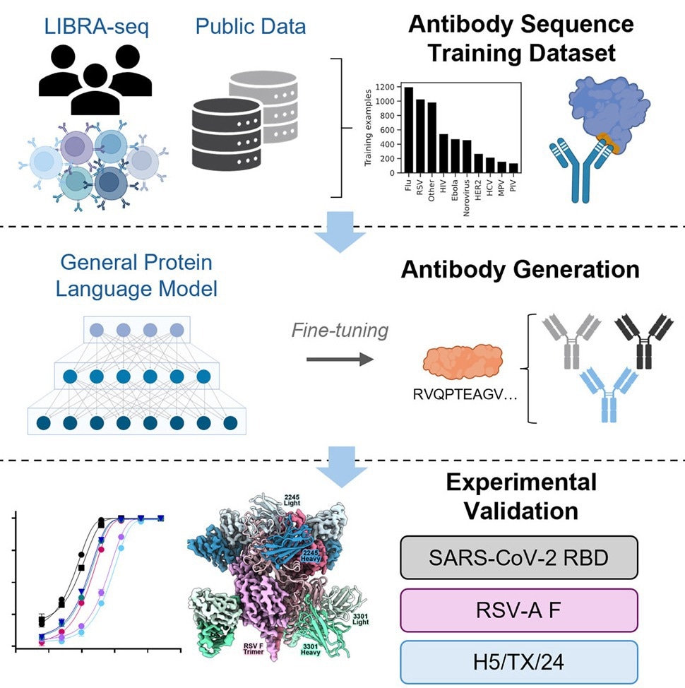 The research team, which included scientists from around the country, Australia and Sweden, showed that a protein language model could design functional human antibodies that recognized the unique antigen sequencies (surface proteins) of specific viruses, without requiring part of the antibody sequence as a starting template.